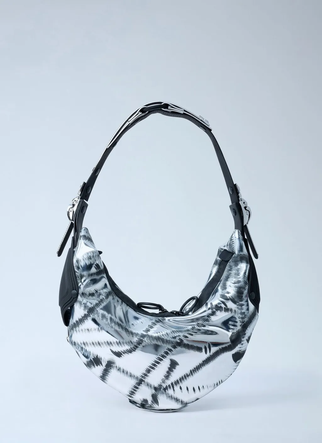 A hobo bag with a metallic silver finish and a black abstract pattern. It features a black adjustable shoulder strap with silver hardware, and black side panels. The bag has a slouchy silhouette with a drawstring closure.