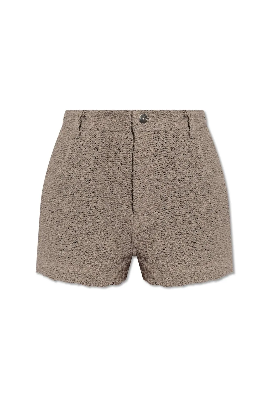 High-waisted shorts with a textured tweed-like fabric. Features a button and zip closure, belt loops, and a raw hem finish.