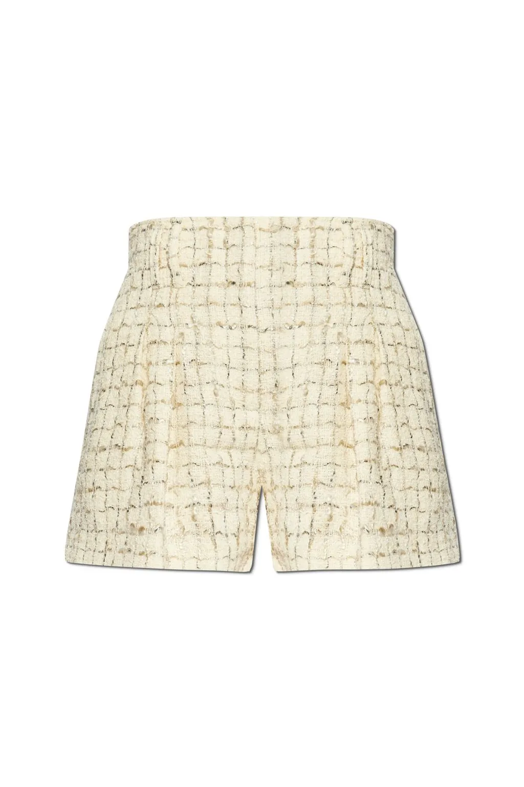 High-waisted tweed shorts with a grid pattern. Features a smocked waistband and a relaxed fit.