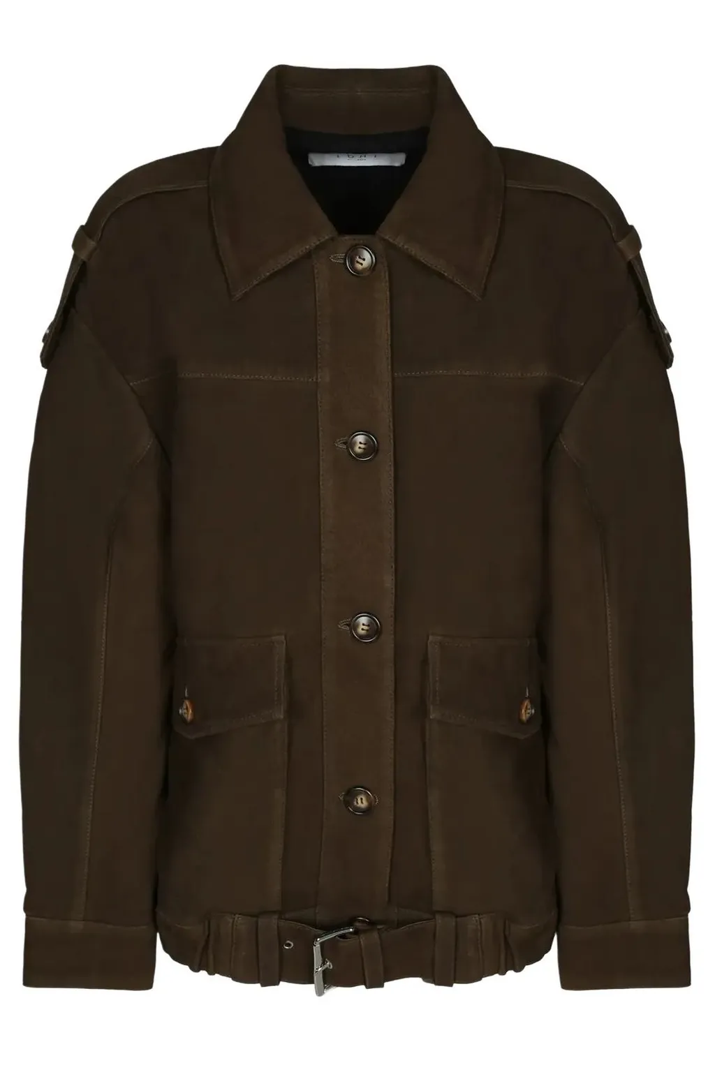 A brown utility jacket with a collared neckline, button-down front, and two flap pockets on the chest. It features epaulets on the shoulders and a cinched waist with a belt. The jacket has a relaxed fit and a button closure at the cuffs.