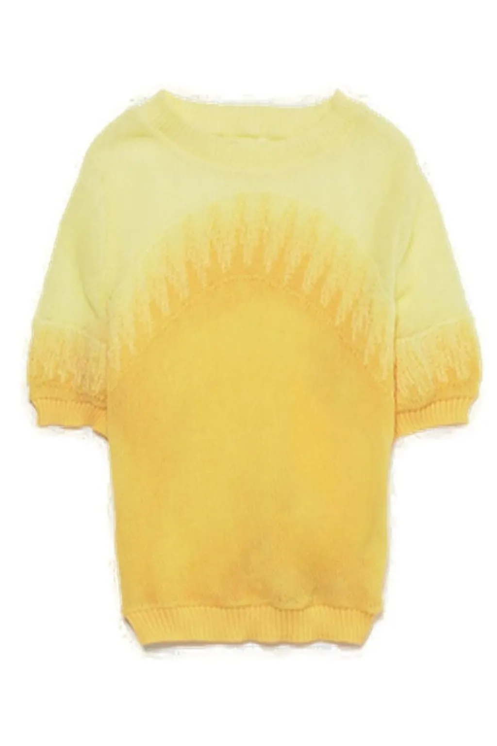A short-sleeved sweater with a crew neck. The sweater features a gradient design from light yellow at the top to a deeper yellow at the bottom. There is a textured, sunburst-like pattern across the chest and on the sleeves.
