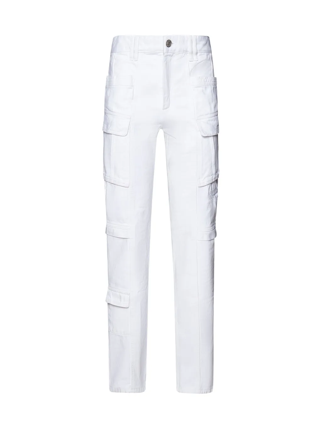 High-waisted cargo pants with multiple pockets on the front and sides. They feature a straight leg silhouette and a zip fly with button closure.