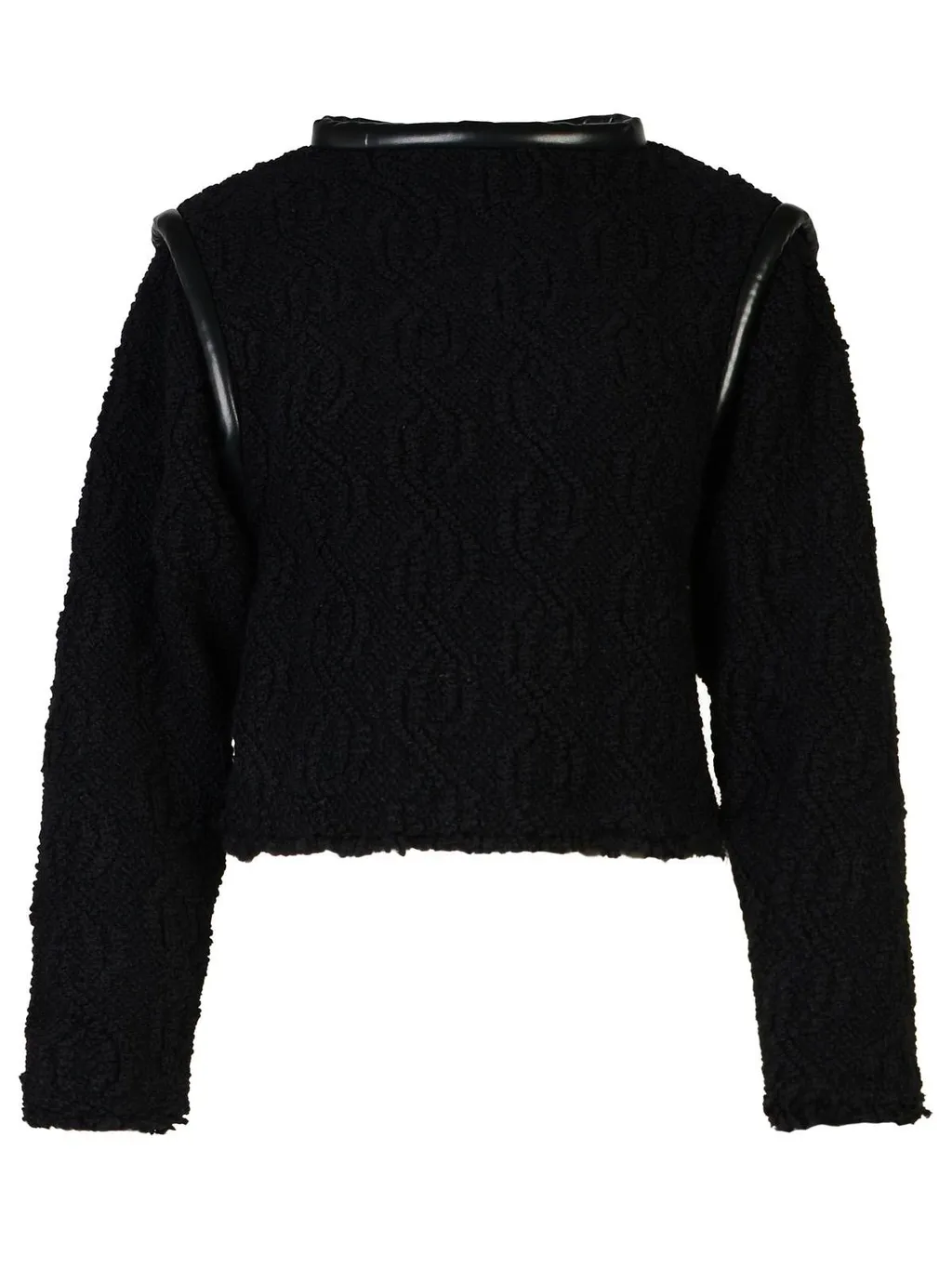 A cropped jacket with a textured black fabric. It features a high neckline and faux leather trim on the collar and shoulder details. The jacket has long sleeves and a raw hem.