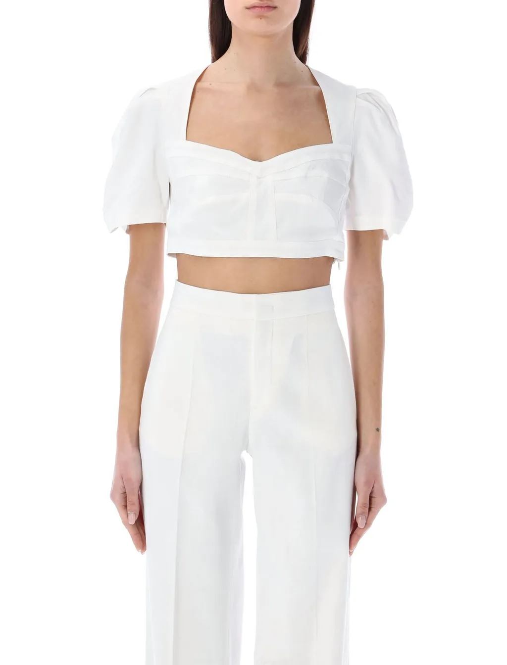 A white cropped top with short puff sleeves and a sweetheart neckline. The top features a fitted bodice with subtle ruching detail at the bust and a cropped hemline.