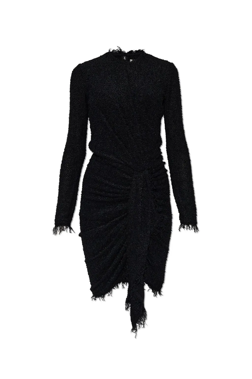 DescriptionA long-sleeved black dress with a mock neckline and a ruched, asymmetrical hem. The dress features a textured fabric with frayed edges at the neckline, cuffs, and hem. The ruched detailing creates a draped effect on the front, with a tie detail at the waist.
