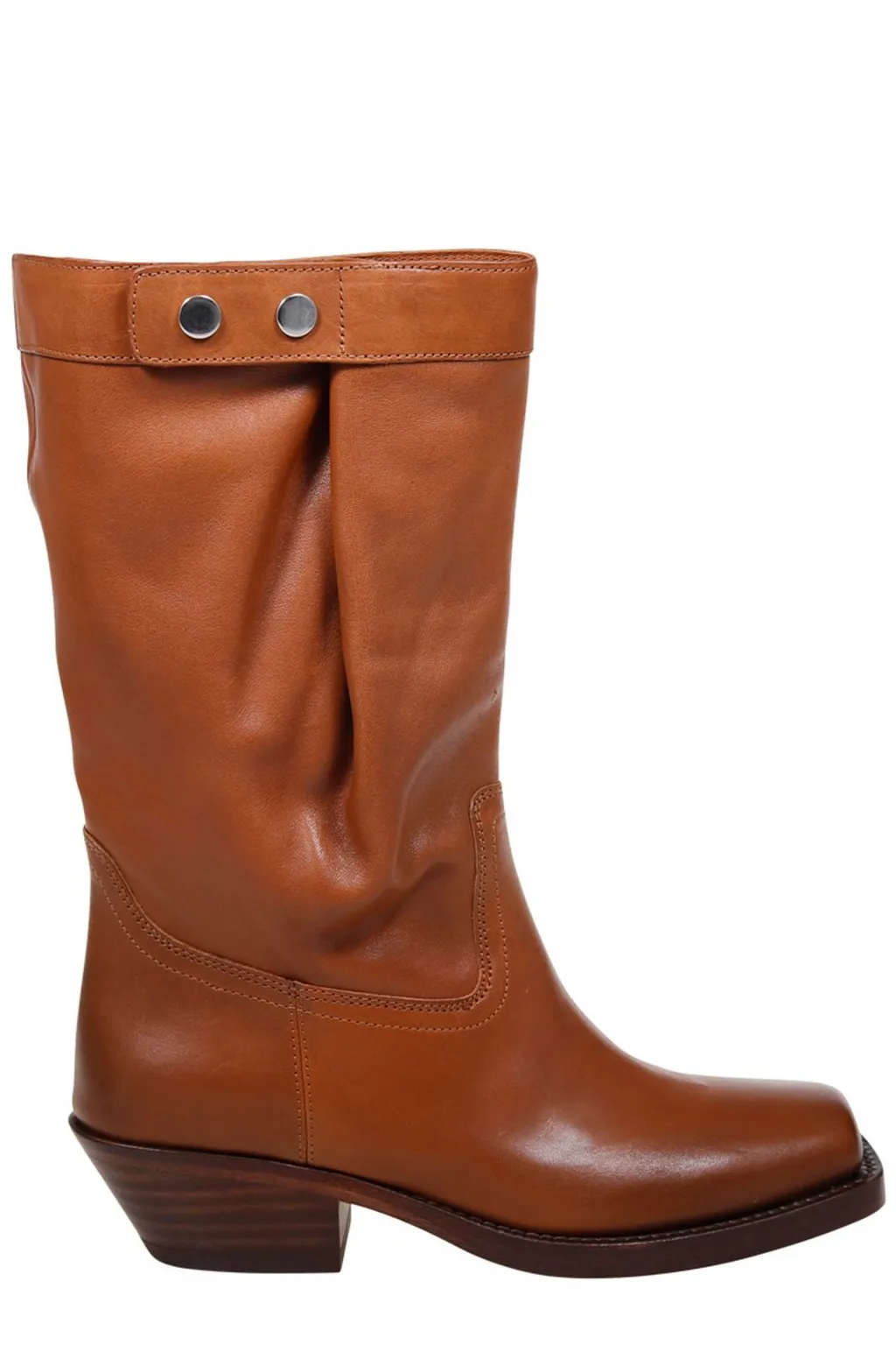 Knee-high boots with a square toe and a stacked block heel. The shaft features a folded-over cuff secured with two silver-tone metal snaps. The leather has a smooth finish and a slightly slouchy appearance.
