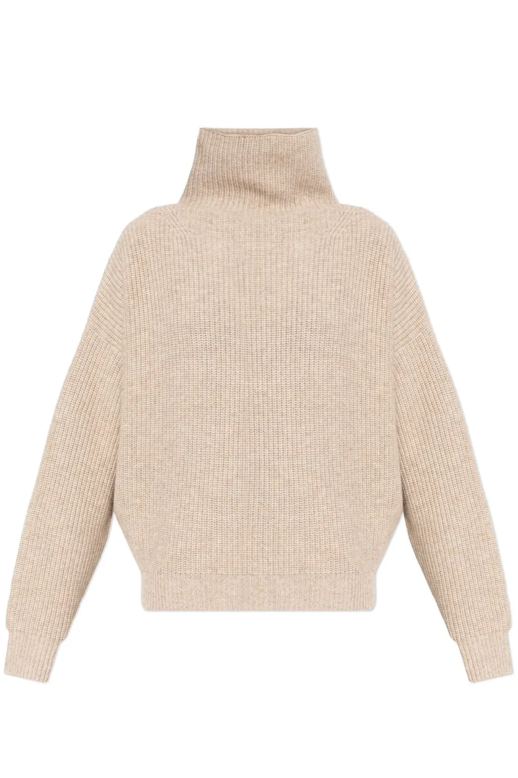 A relaxed-fit, ribbed knit turtleneck sweater with a high neckline and long sleeves. The sweater has a dropped shoulder and a slightly cropped hem.