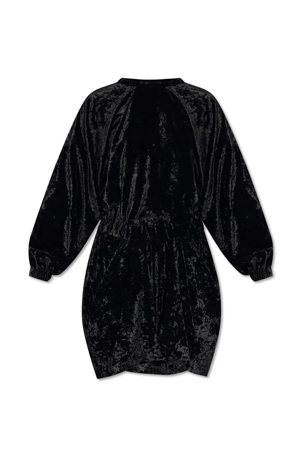 A long-sleeved black velvet dress with a high neckline and a cinched waist. The dress has a relaxed fit with voluminous sleeves that taper at the cuffs.