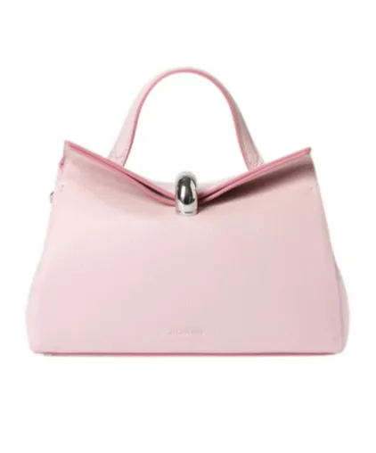 DescriptionGoatskin shoulder bag in pale pink. Features a silver-tone metal half-ring magnetic buckle closure and an embossed logo on the front. Includes adjustable and detachable shoulder straps.