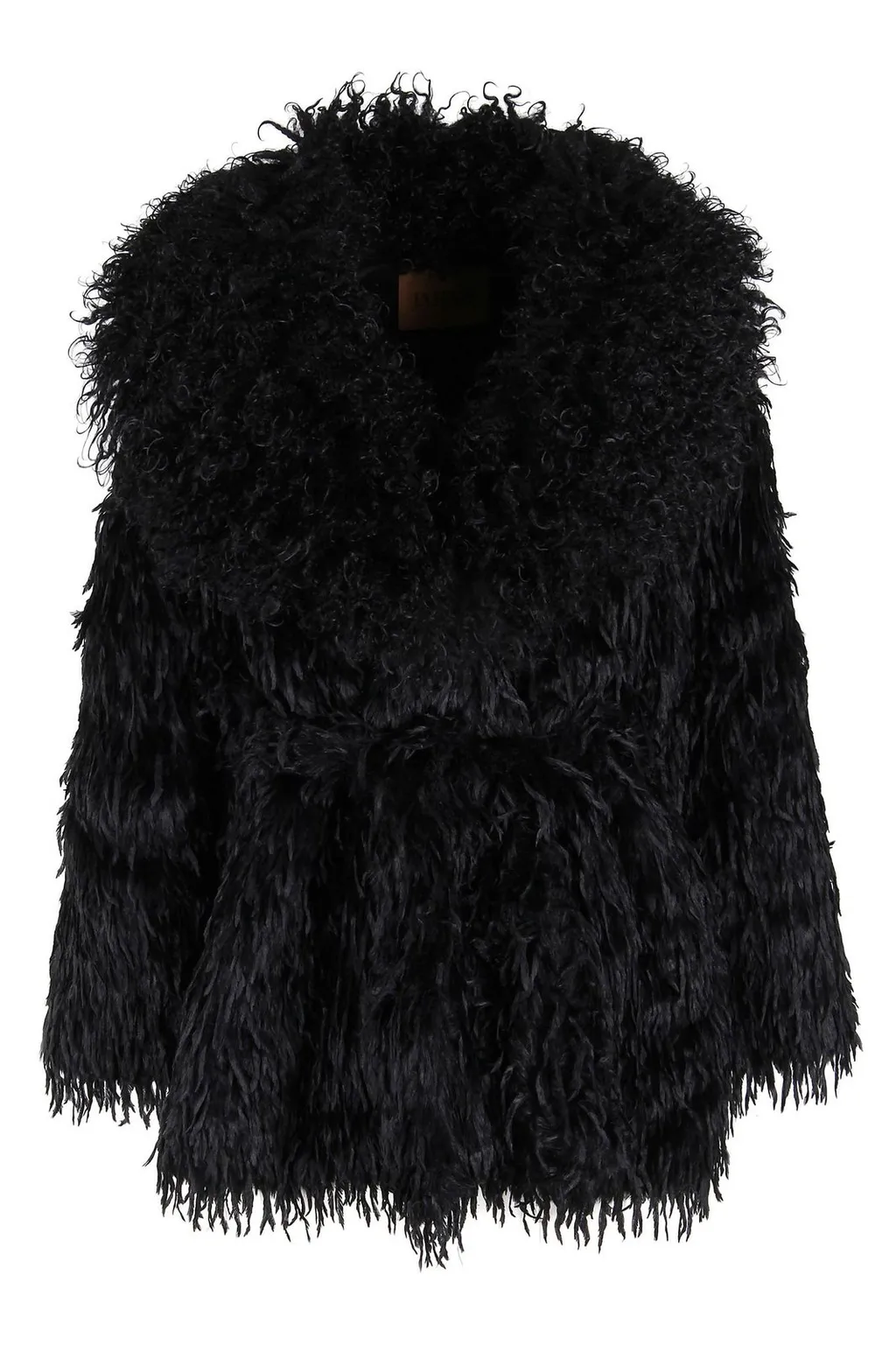A black faux fur coat with a wide shawl collar and a tie belt at the waist. The coat has a shaggy texture and a fringe hem.