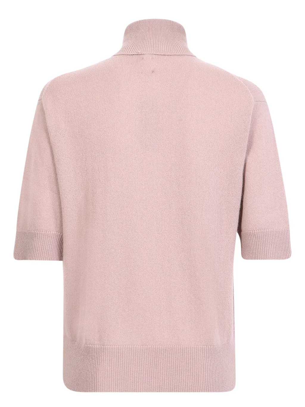 A pink, short-sleeved, turtleneck sweater with a ribbed hem and cuffs.