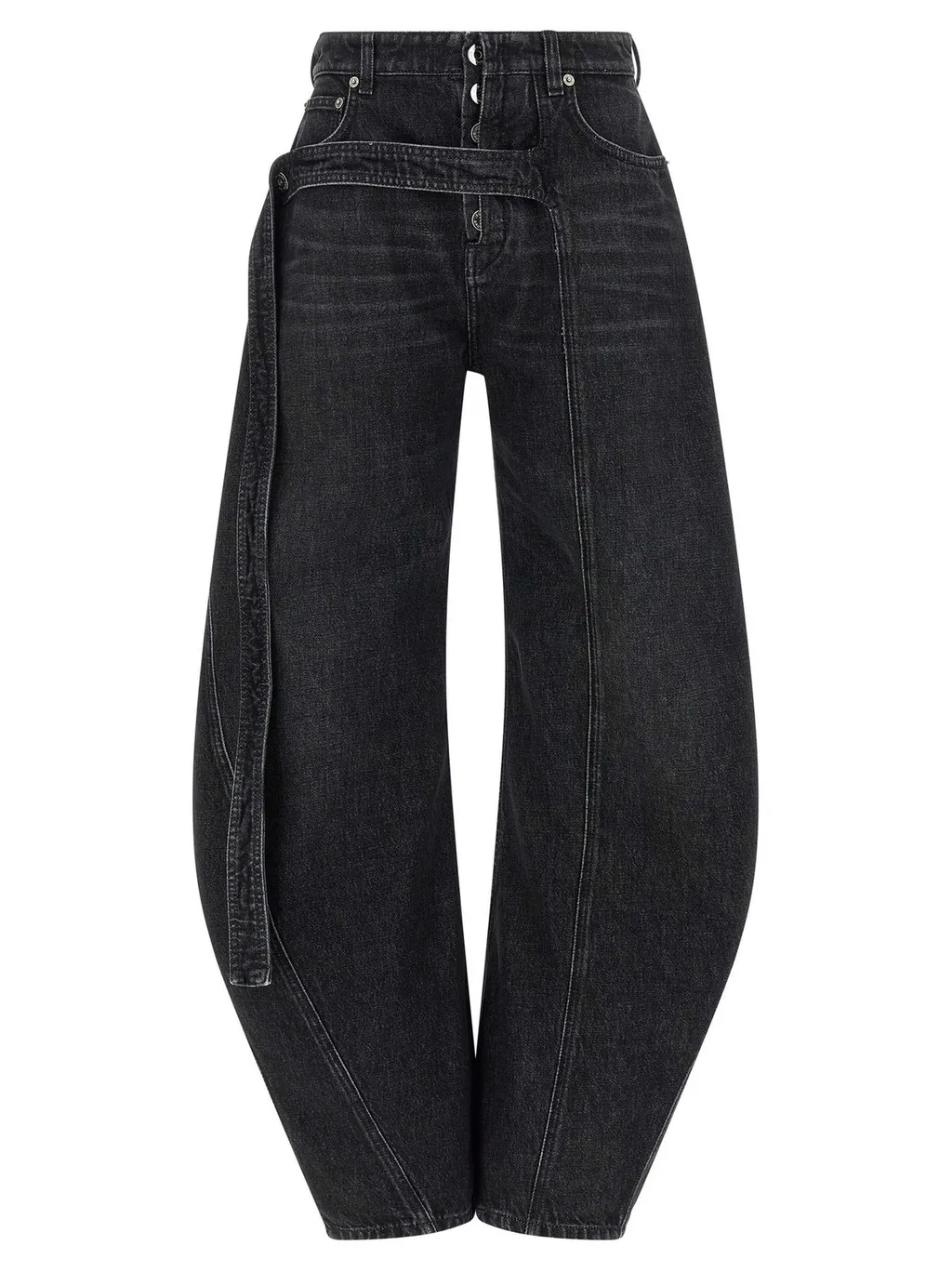 High-waisted, wide-leg jeans with a dramatic balloon silhouette. Features a button fly, belt loops, and a removable self-tie belt. The denim has a dark wash and visible seam detailing down the front of each leg.