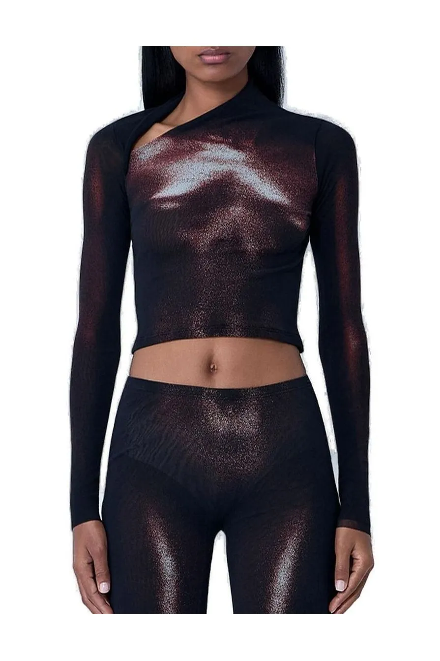 A long-sleeved crop top with an asymmetrical neckline and a cutout detail on the chest. The top features a metallic, abstract print in shades of red and silver against a black base. The fabric appears to be sheer.