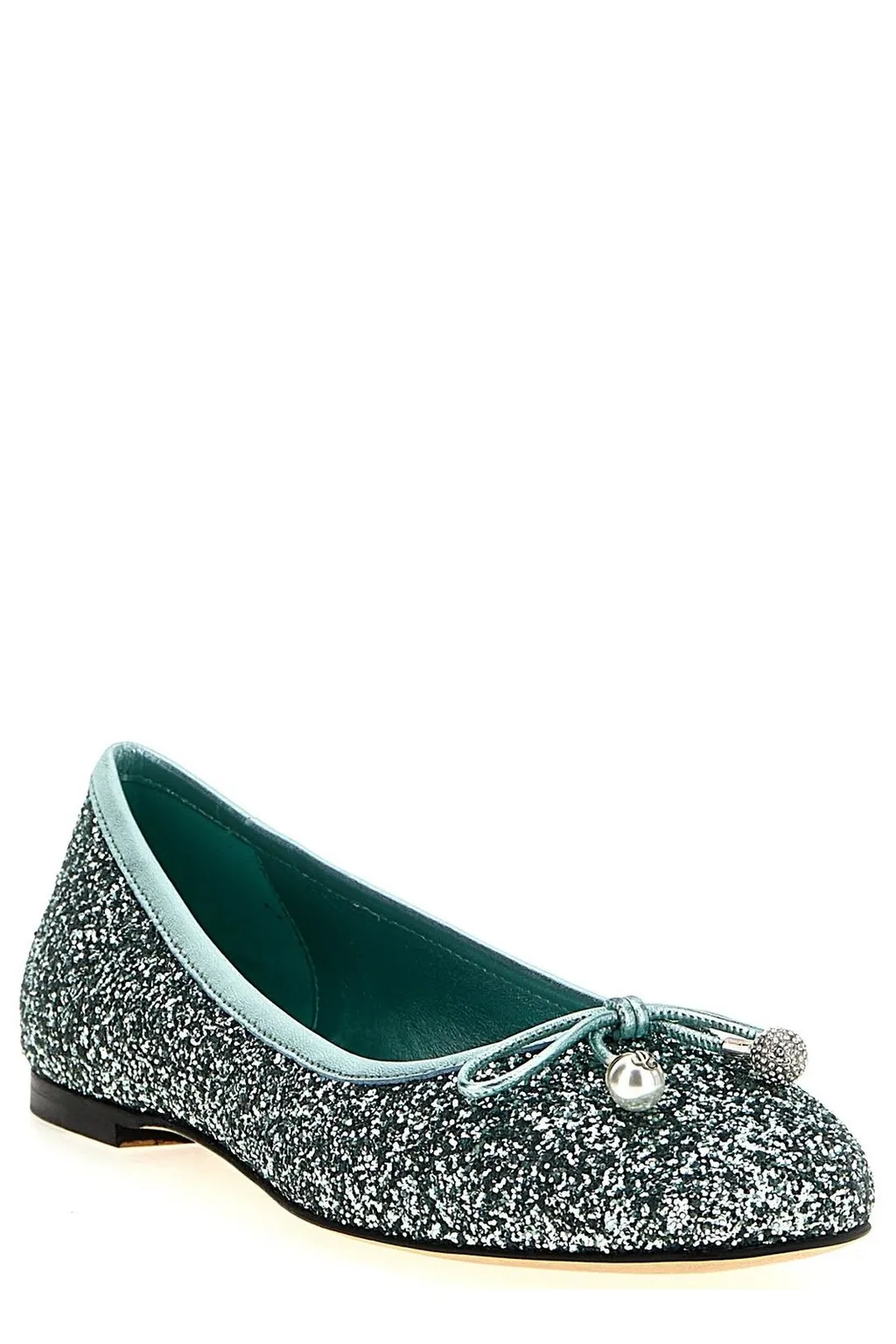 Sparkly ballet flats with a rounded toe and a decorative bow with a pearl accent on the vamp.