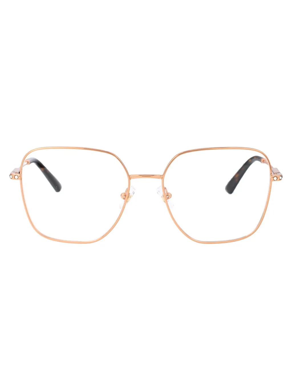 DescriptionThese glasses feature a geometric, oversized frame with a thin rose gold metal construction. The temples are also rose gold and have a tortoiseshell pattern at the ends. The lenses are clear, suggesting they are for fashion or blue light filtering.