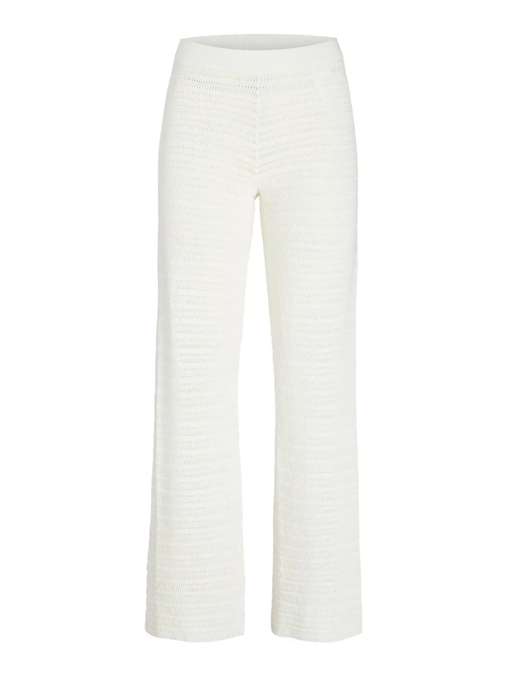 These cropped wide leg pants feature a high-rise waist and a relaxed fit. The knit fabric has a textured, open-weave pattern throughout.