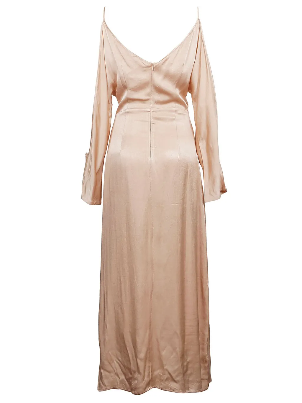 A long, flowing maxi dress with a v-neckline and spaghetti straps. It features long, billowy sleeves with open cuffs and a wrap-style front with a high slit. The dress has a cinched waist and a satin finish.