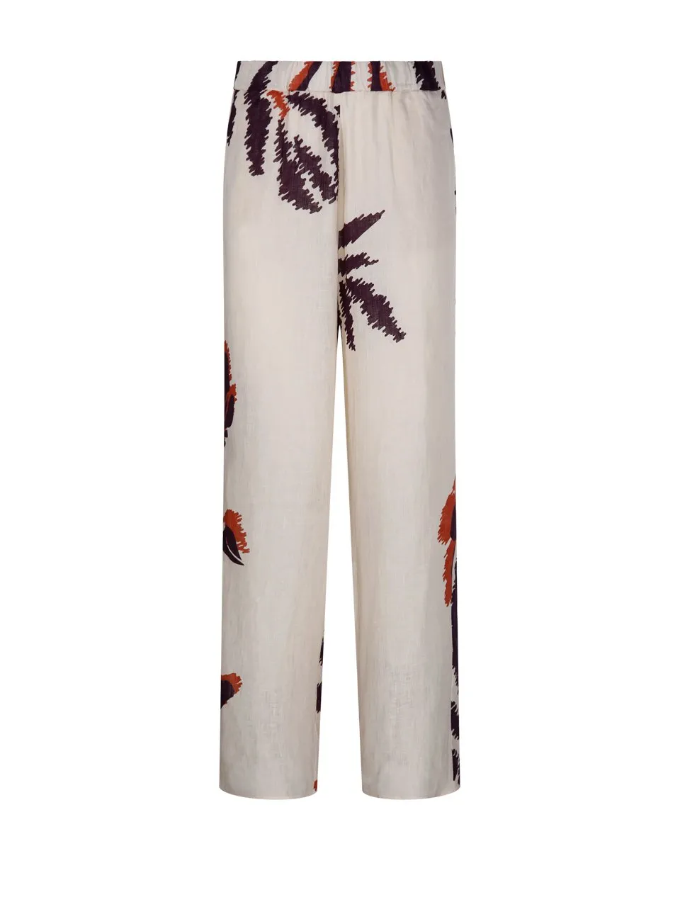 High-waisted palazzo pants with a relaxed fit and a tropical palm leaf print. Features a comfortable elastic waistband.