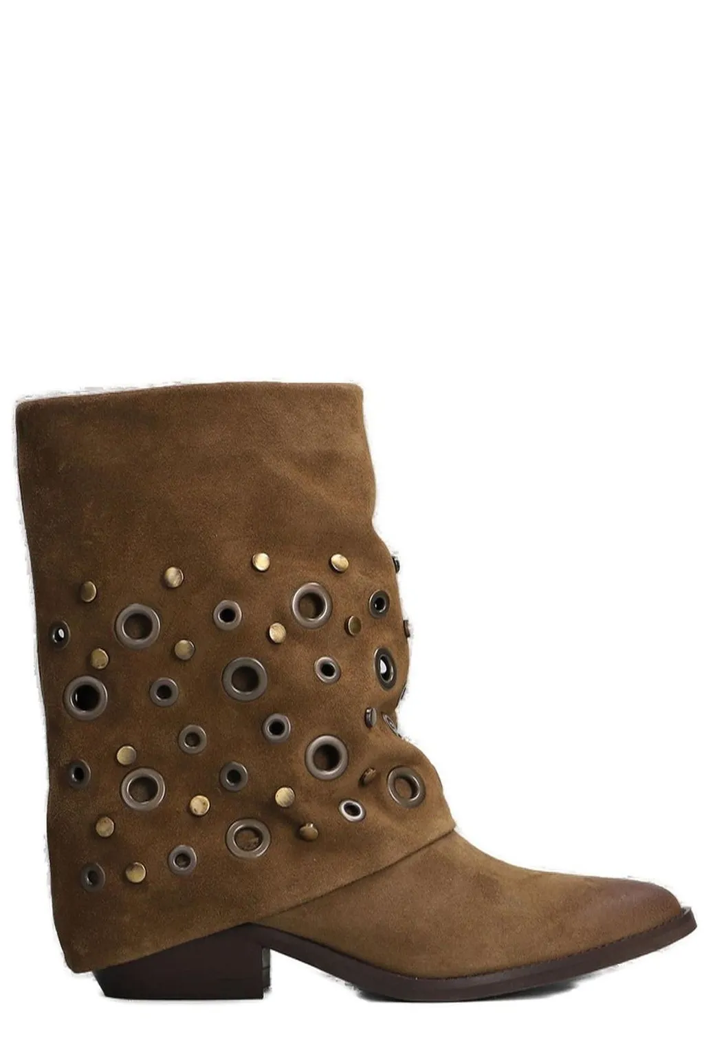These are brown suede ankle boots with a pointed toe and a low heel. The shaft of the boot features a decorative cutout design with metal eyelets and studs. The boot has a slouchy, folded-over effect at the top.