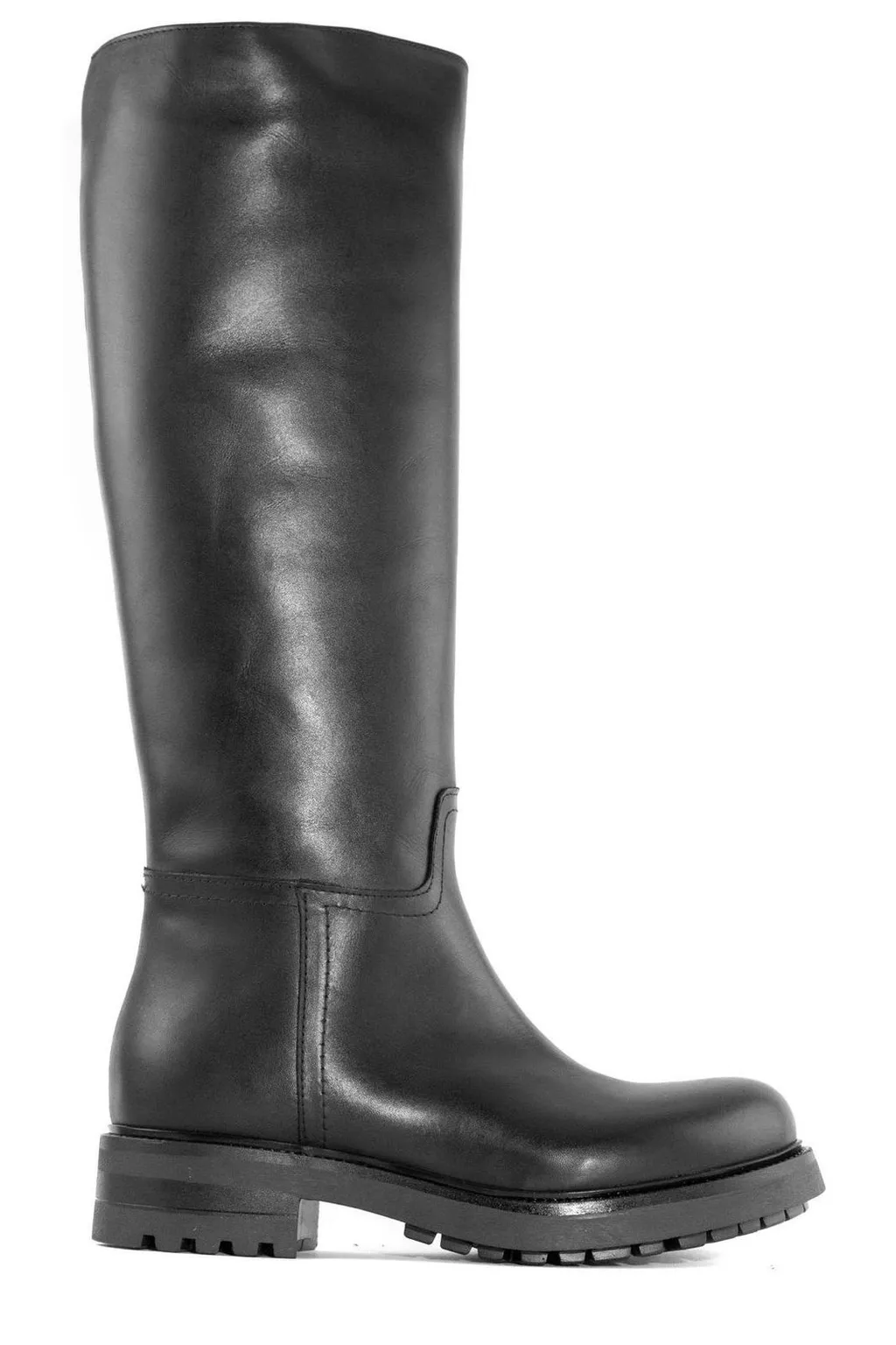 These are black, knee-high boots with a round toe and a lug sole. They have a pull-on style with a flat heel. The shaft of the boot has a subtle seam detail.