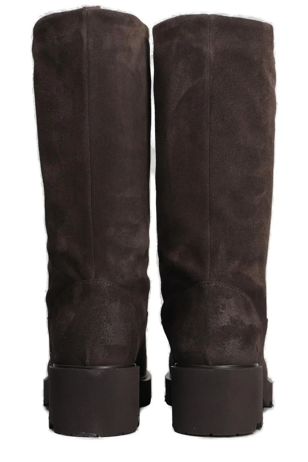 Brown knee-high boots with a chunky platform sole and block heel. The boots have a slouchy shaft and a rounded toe. They appear to be made of a suede-like material.