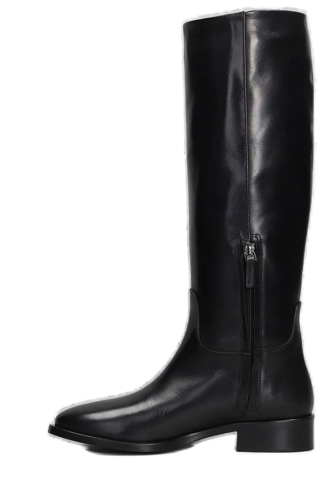 Classic knee-high boots crafted from smooth leather. They feature a square toe, a low block heel, and a side zipper closure for easy wear. The sleek silhouette makes them a versatile addition to any wardrobe.