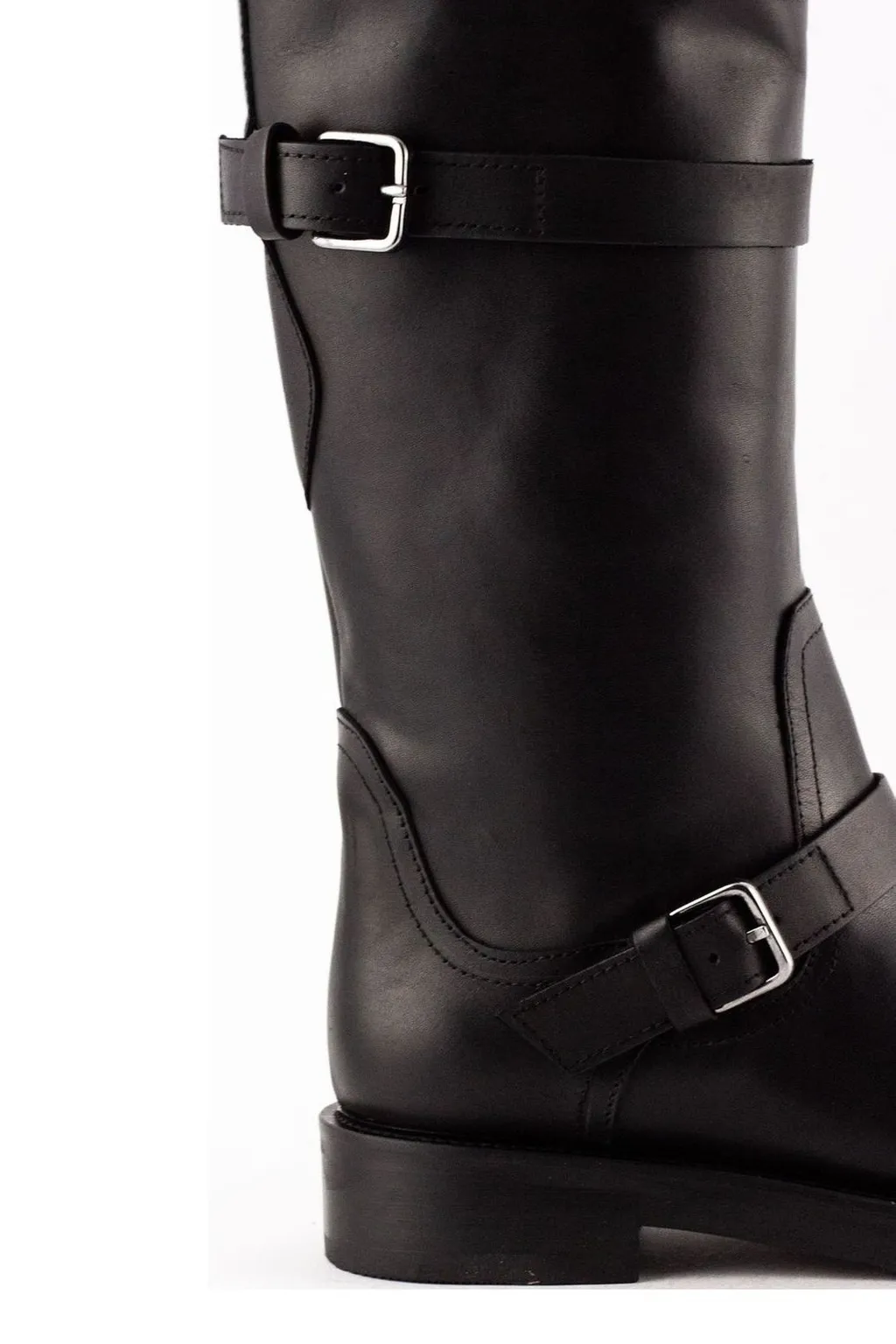 Knee-high black leather boots with a round toe. Features two adjustable buckle straps, one around the ankle and another below the knee. The boots have a pull tab at the back and a thick sole.