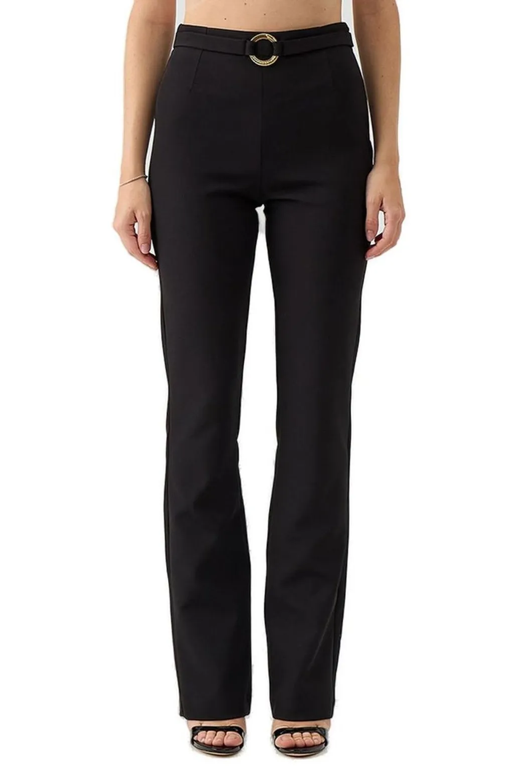 High-waisted trousers with a flared leg and a gold-tone buckle belt. The trousers feature a concealed zipper closure at the back.