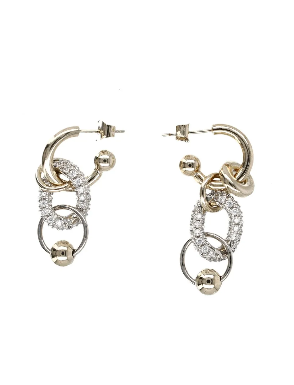A pair of statement earrings featuring a hoop base with a dangling chain of interlocking links. One link is encrusted with pave crystals, and another is a polished metal ring with a smooth sphere charm. The earrings have a post backing.