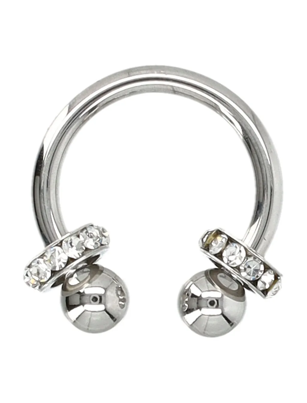 A horseshoe barbell earring made of silver-toned metal. It features two spherical end balls. Each end ball is attached to a decorative bar embellished with clear crystals. The bar is positioned diagonally across the end ball.