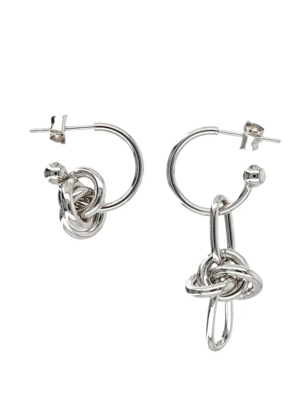 DescriptionA pair of silver-tone hoop earrings with a knot detail. The earrings feature a hoop that connects to a dangling knot design made of intertwined metal. The design is asymmetrical, with one earring having a more compact knot and the other a more elongated one.