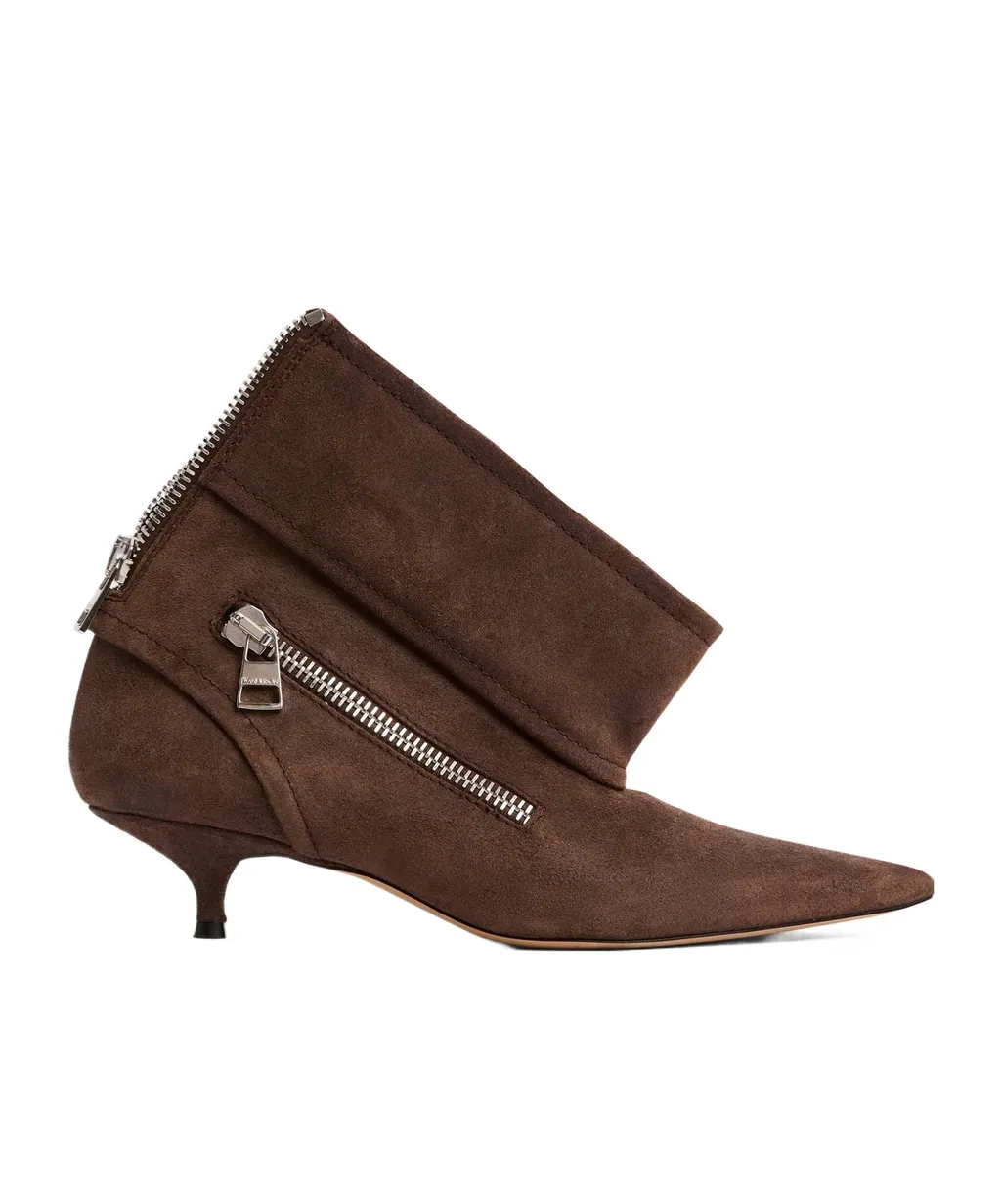 Calfskin ankle boots with a kitten heel. Features decorative zippers on the sides and rear zippers for closure. Silver hardware.