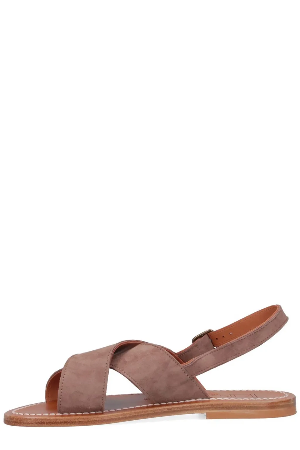 Flat sandals with a slingback strap and a buckle closure. The upper features two crossed straps for a secure and stylish fit. The sole is made of leather.