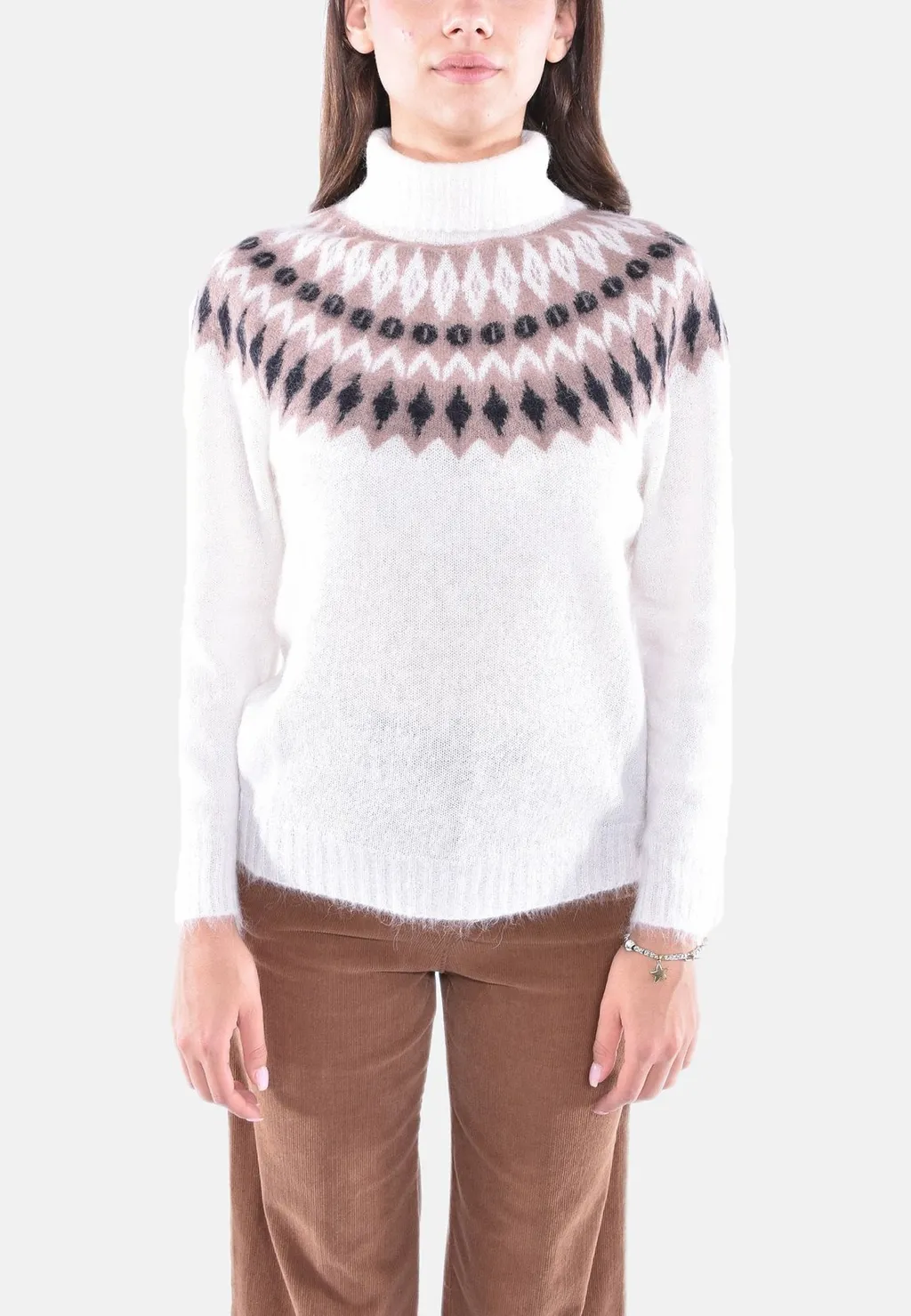 A white, fuzzy, long-sleeved turtleneck sweater with a fair isle pattern around the yoke. The pattern features diamond shapes in brown, black, and pink.