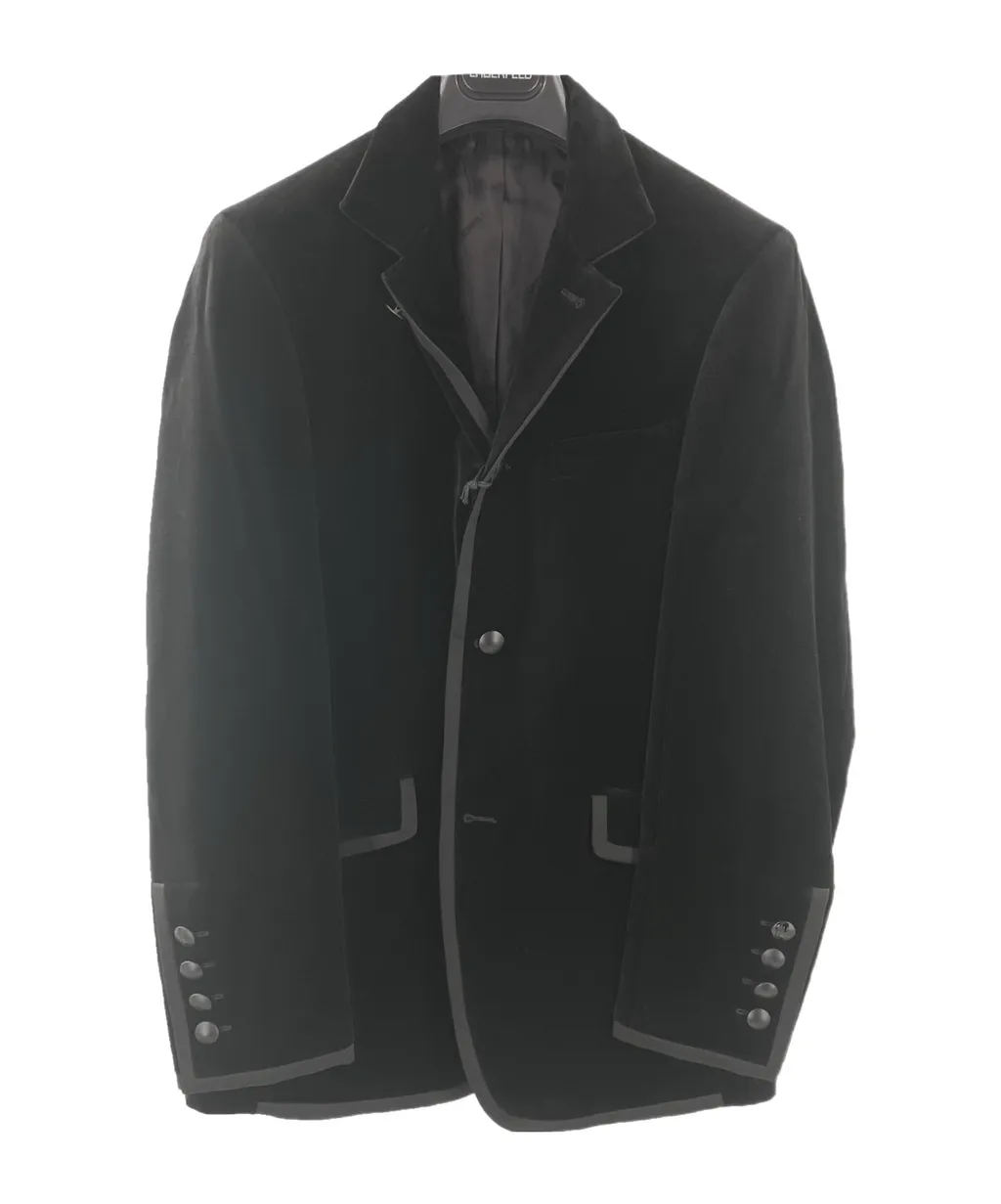 Velvet blazer with a single-breasted silhouette. Features a notched lapel, single-row button closure, and decorative buttoned cuffs. Includes contrast trim detailing.