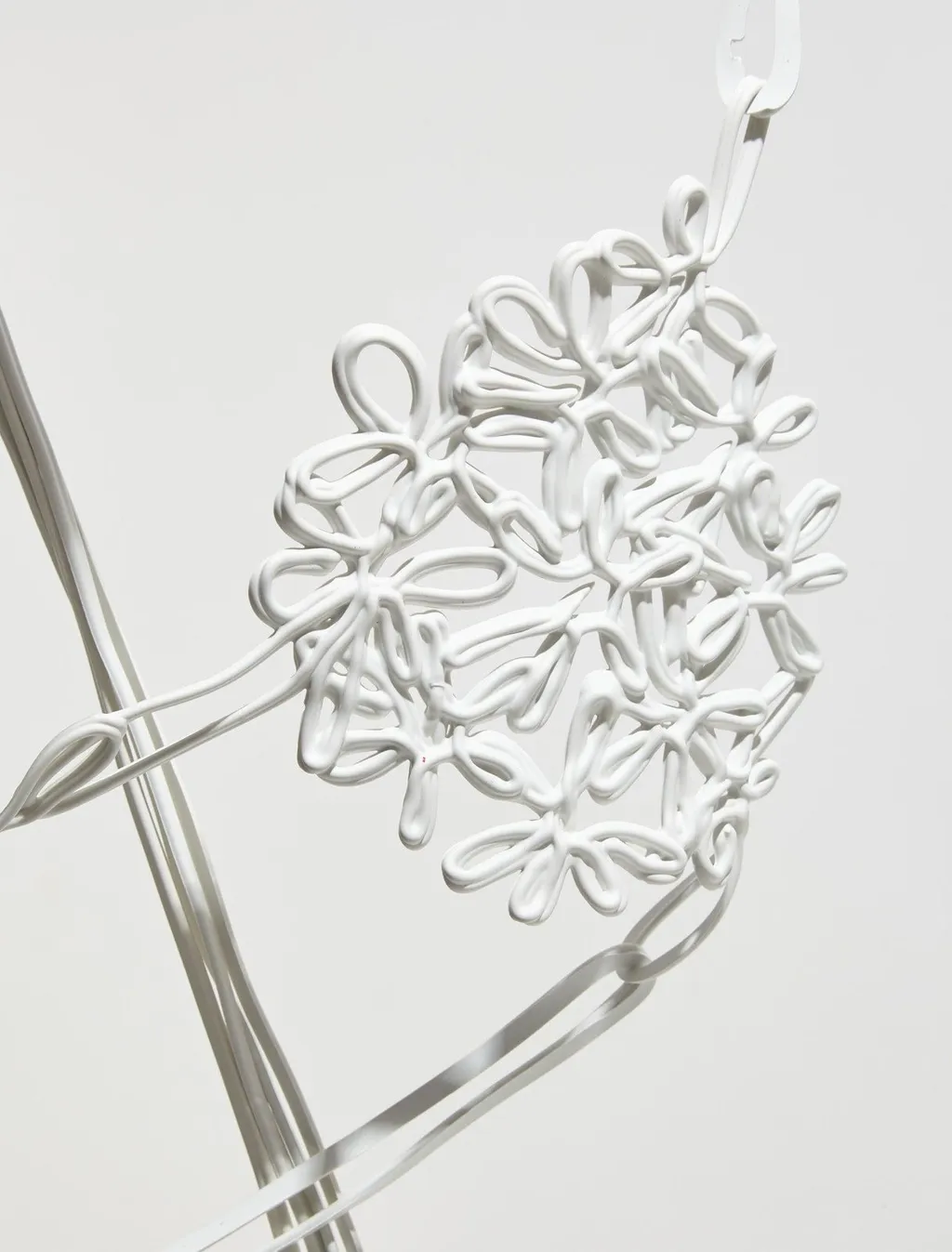 A white bikini top with a floral applique detail. It features thin straps that tie at the back and neck, with long, flowing ties.