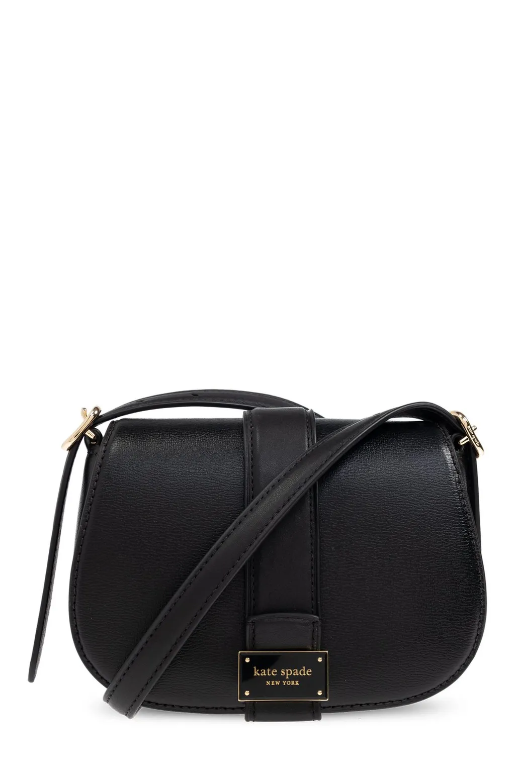 A black leather saddle bag with a flap closure and a gold-tone logo plate. It features a single top handle and an adjustable shoulder strap.