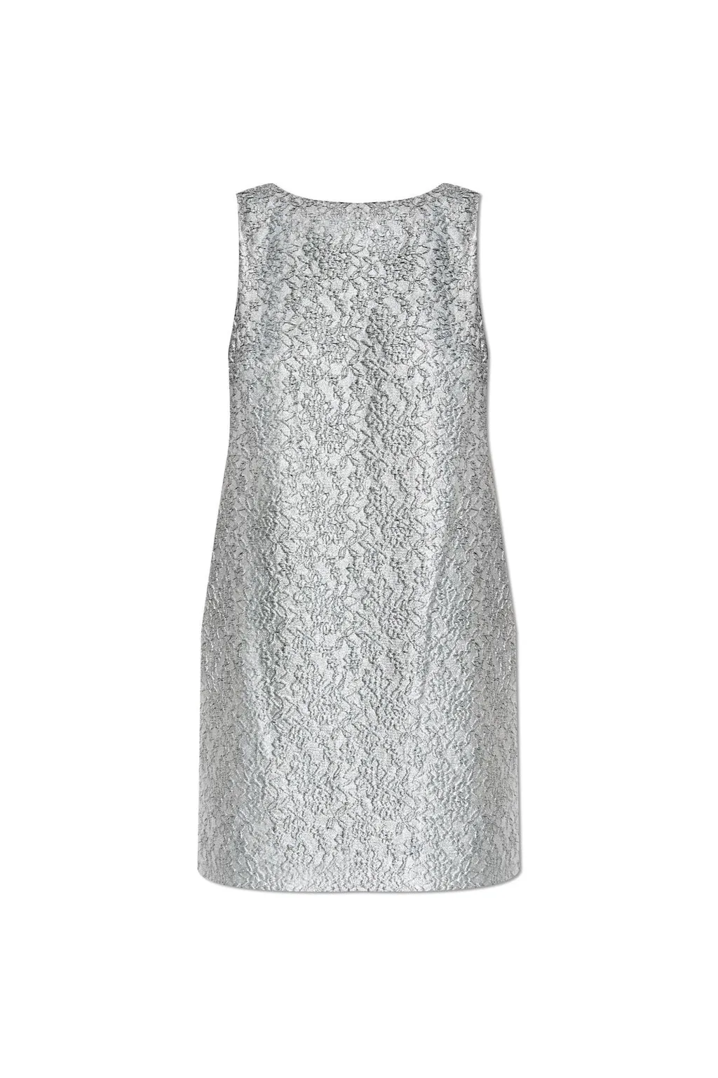 A sleeveless shift dress with a textured, metallic-like fabric. The dress has a simple, straight silhouette and a rounded neckline.