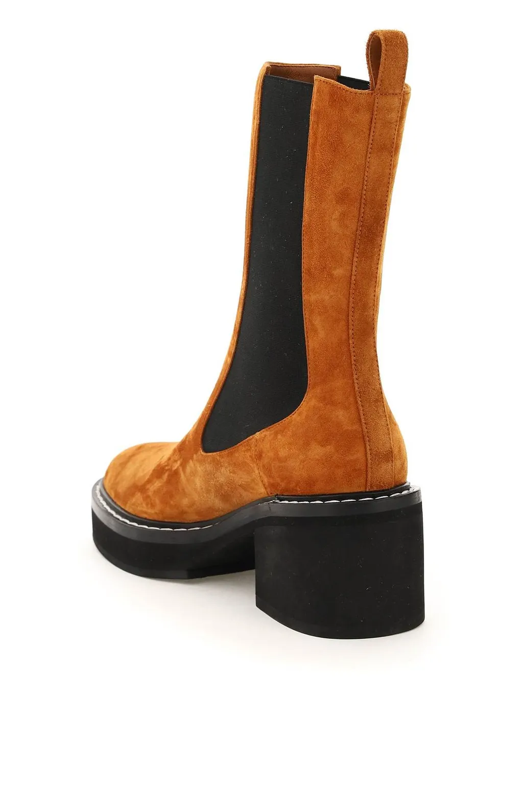 Ankle boots with a round toe and a chunky block heel. Features elastic side panels for easy wear and a pull tab at the back. The sole is thick and lugged, with visible white stitching around the edge.
