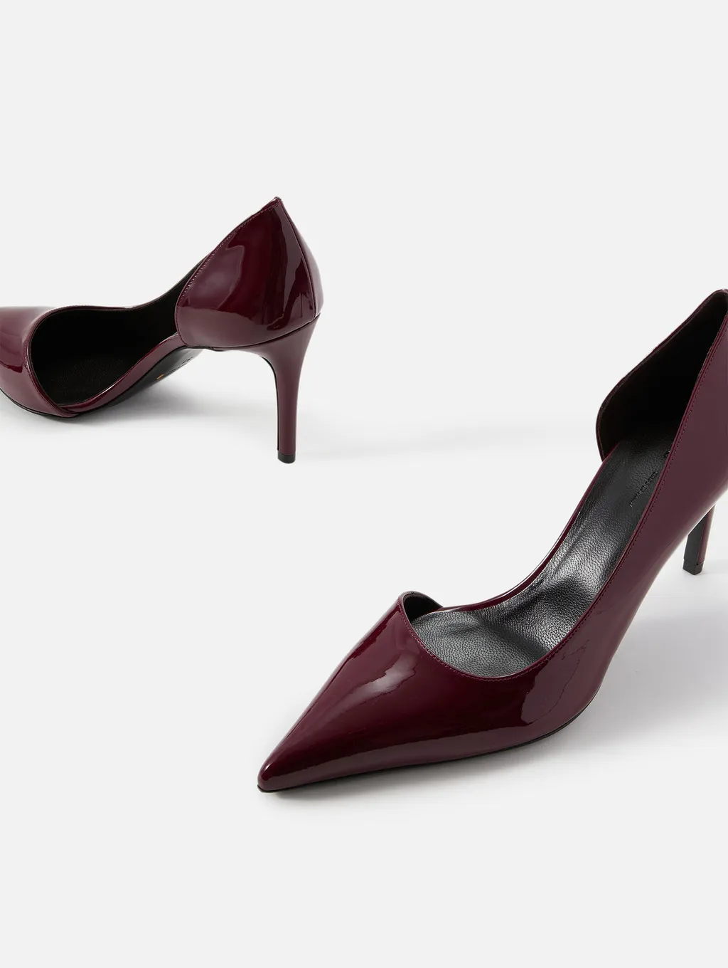 Lacquered leather pumps with a pointed toe and thin heel. Features a distinctive v-shaped vamp.