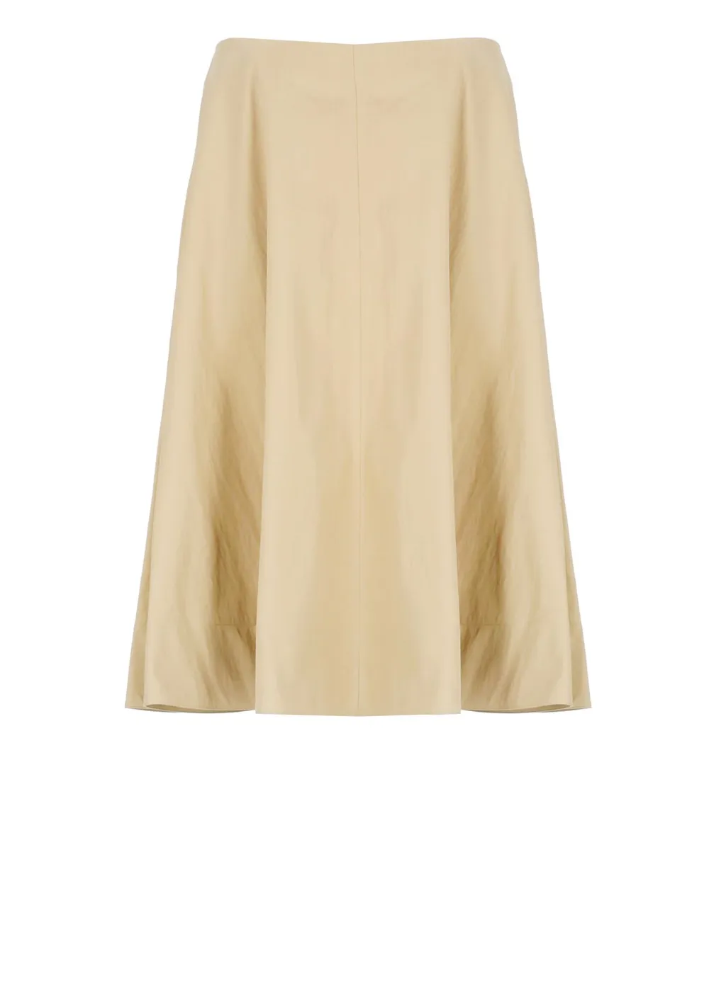 A midi-length a-line skirt in a solid beige color. It features a high waist and a flared silhouette.