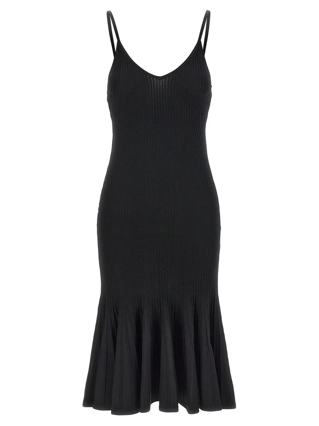 A sleeveless black ribbed knit midi dress with a v-neckline and spaghetti straps. The dress features a fitted bodice that flares out into a ruffled hemline.