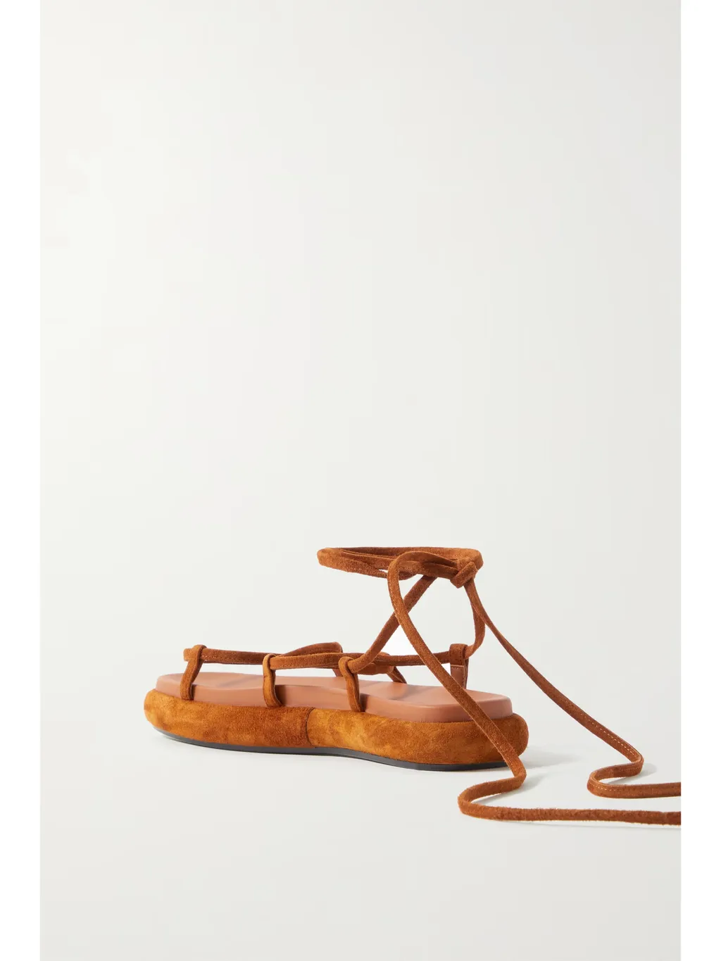 Calfskin sandals with a flat sole and tie-around ankle straps. Features a minimalist design with thin straps.