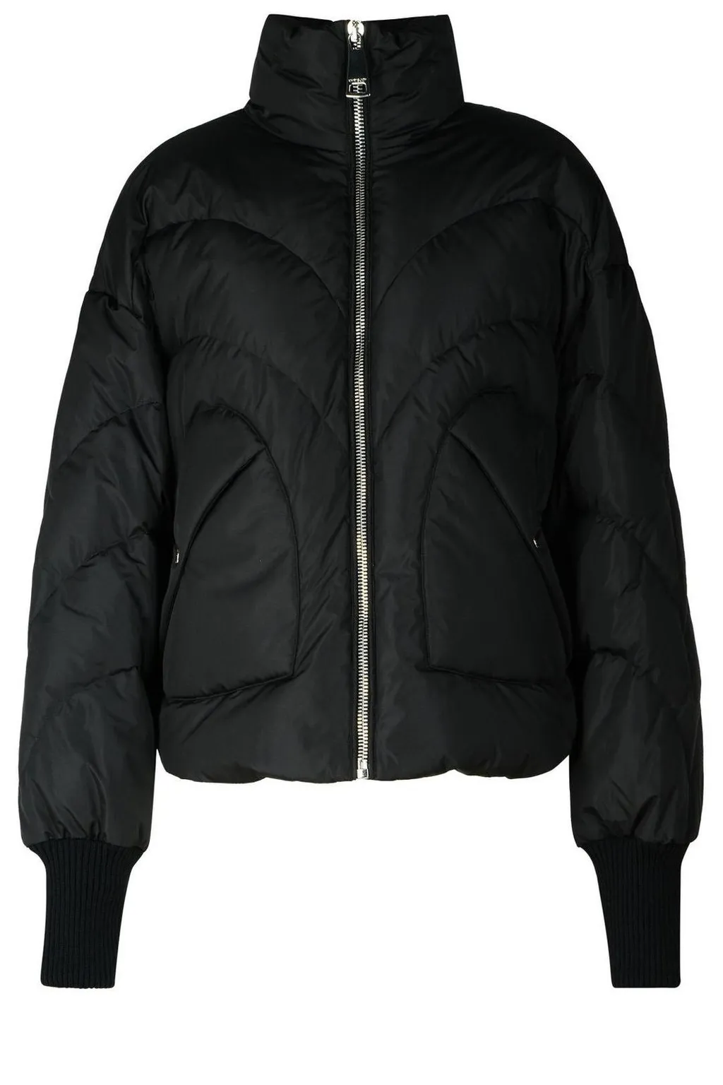 A black puffer jacket with a high collar and a zip-up front. It features chevron-style quilting and ribbed cuffs. The jacket has a relaxed fit.