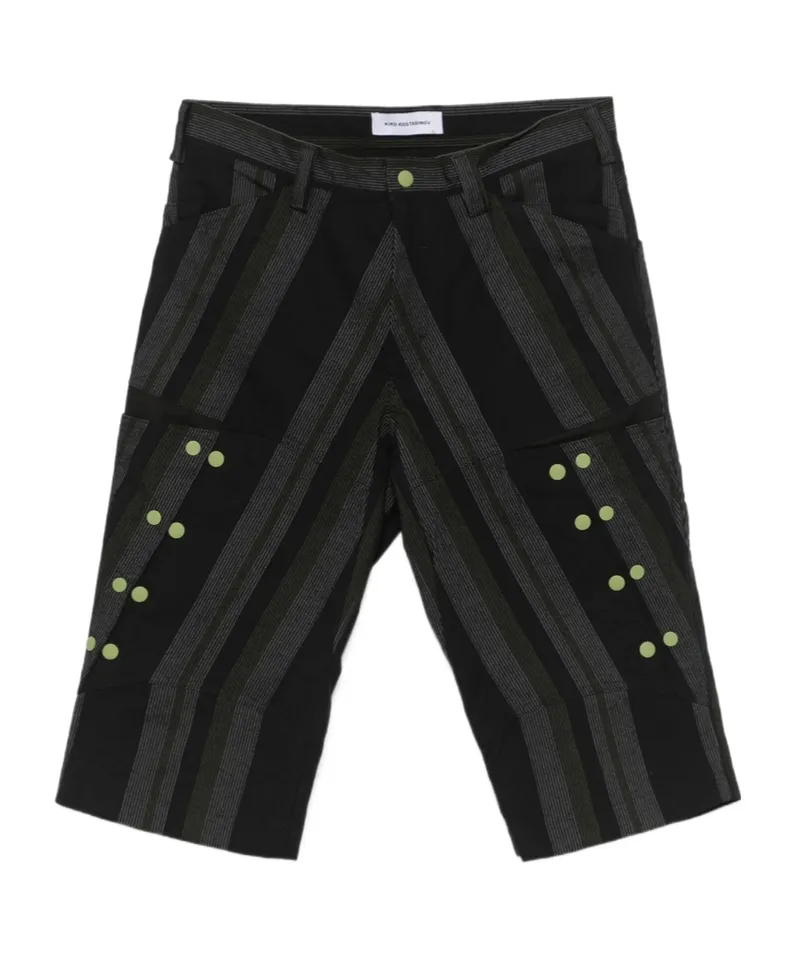 Shorts with a diagonal stripe pattern, featuring black snaps and zippers on the front, belt loops, and side pockets.