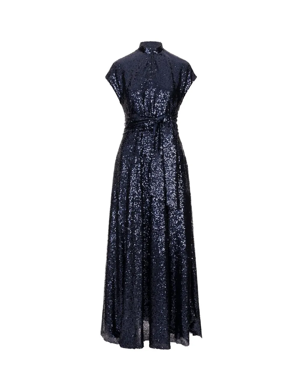 A floor-length maxi dress covered in shimmering black sequins. It features a high neckline, short cap sleeves, and a self-tie belt at the waist to cinch the silhouette. The dress has a full, flowing skirt.