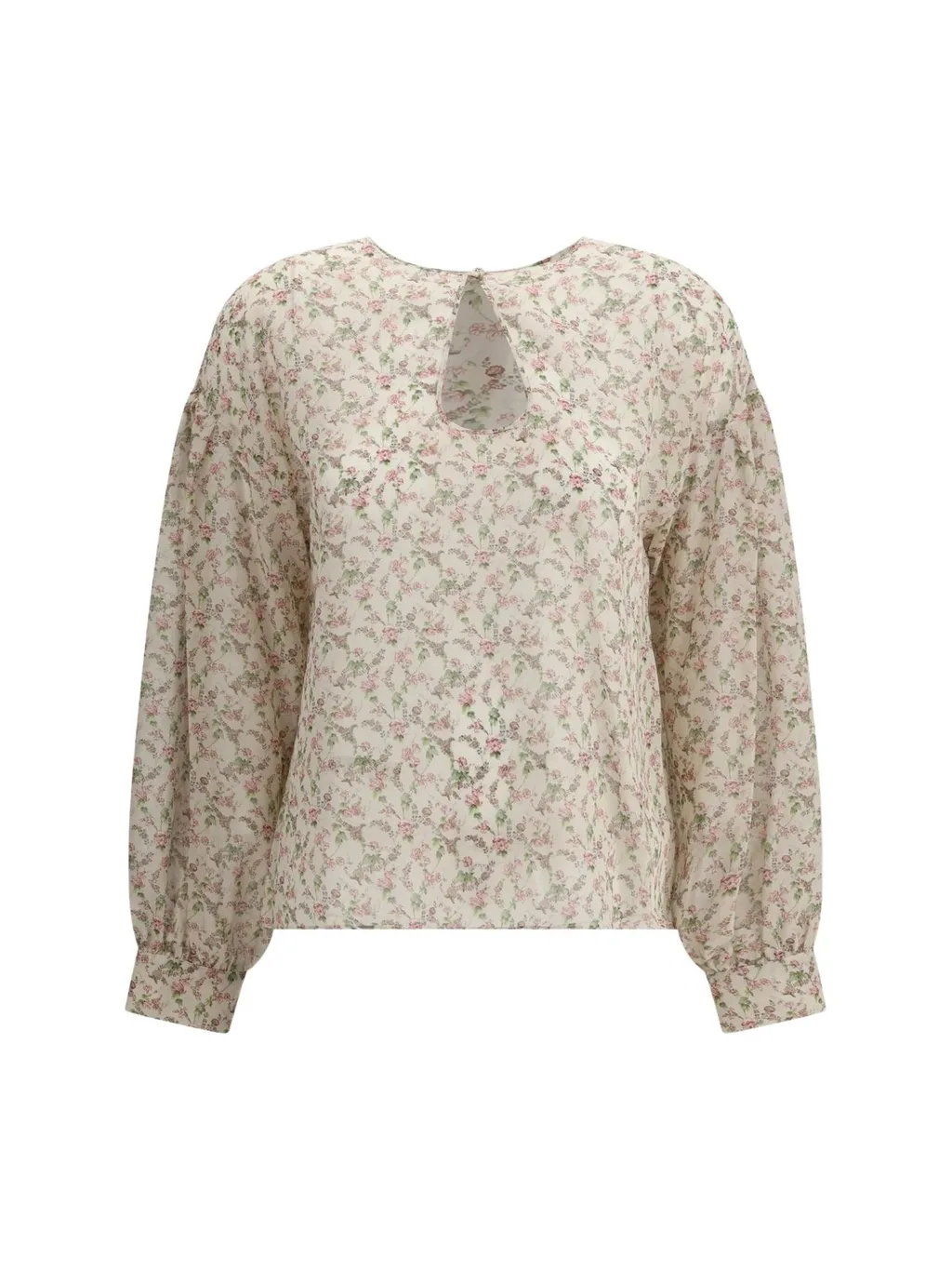 DescriptionA long-sleeved blouse with a round neckline and a keyhole cutout at the back. The blouse features a delicate floral print in shades of pink and green on a cream background. The sleeves are full and gathered at the cuffs, creating a voluminous silhouette. The hemline is straight.