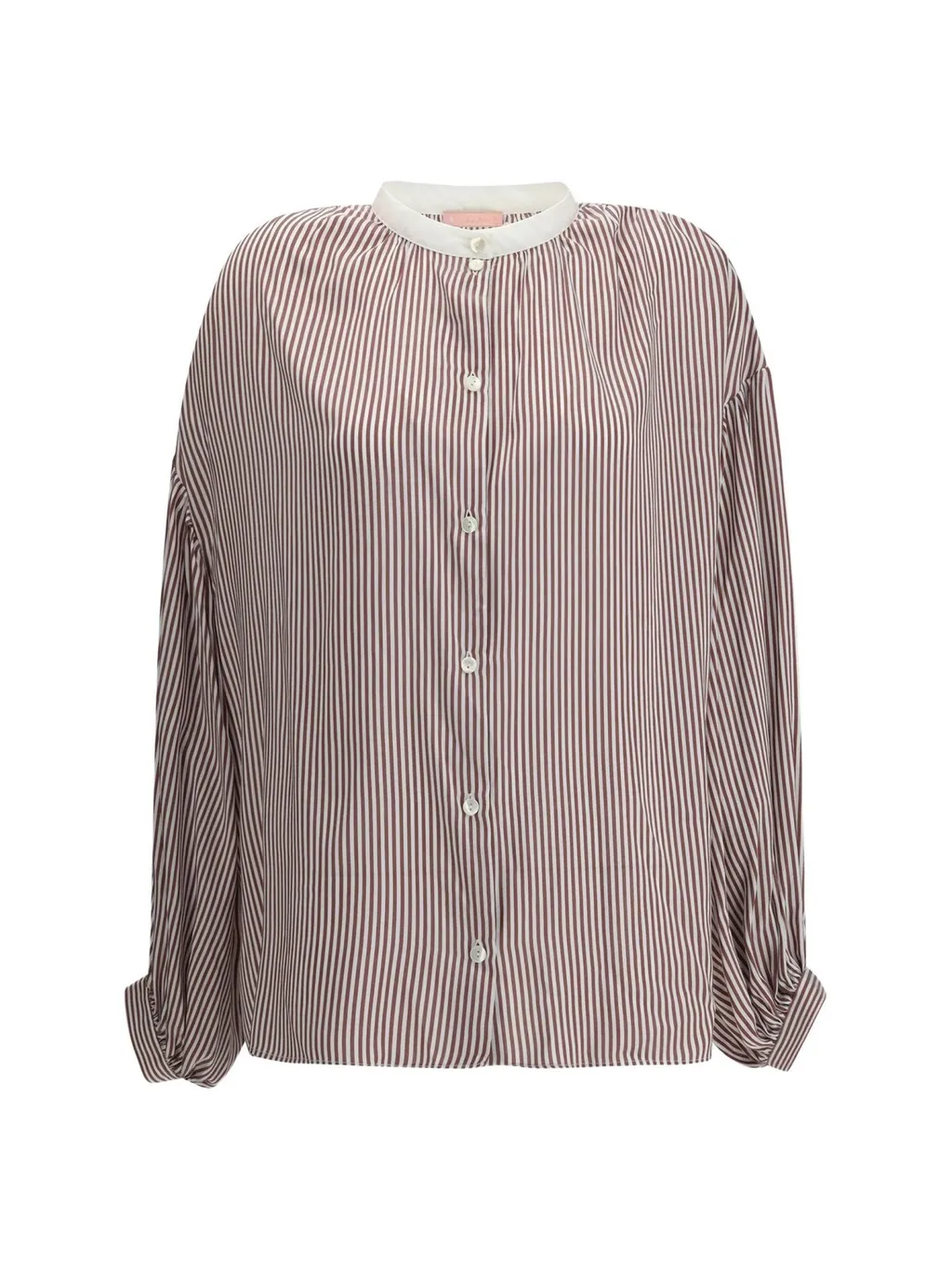 A long-sleeved, collared shirt with a vertical stripe pattern. It features a button-up front, gathered detailing at the neckline, and cuffed sleeves.