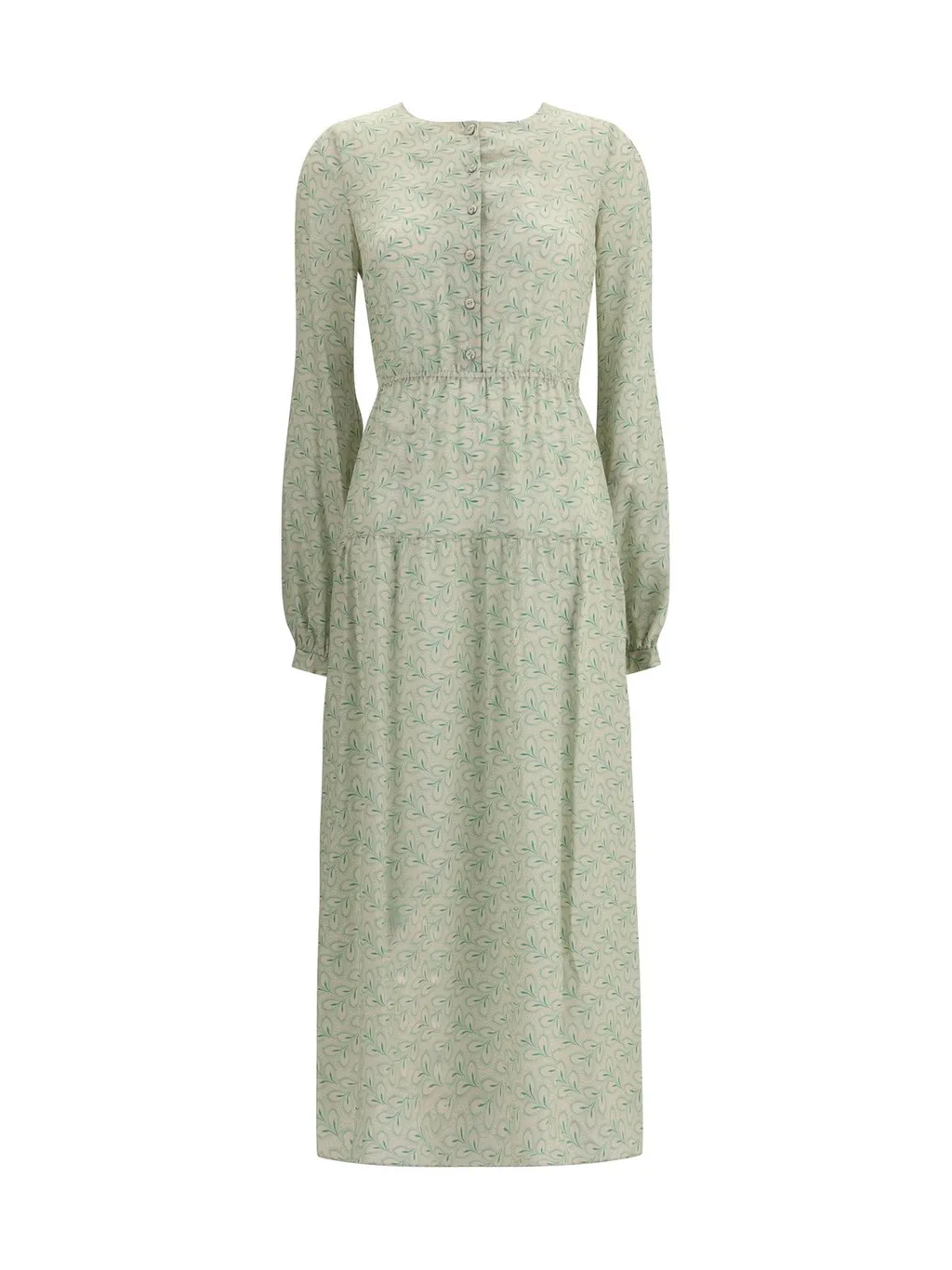 A long-sleeved midi dress with a round neckline and a button-down front. It features an elasticated waistband and a tiered skirt. The dress has a subtle all-over leaf print.