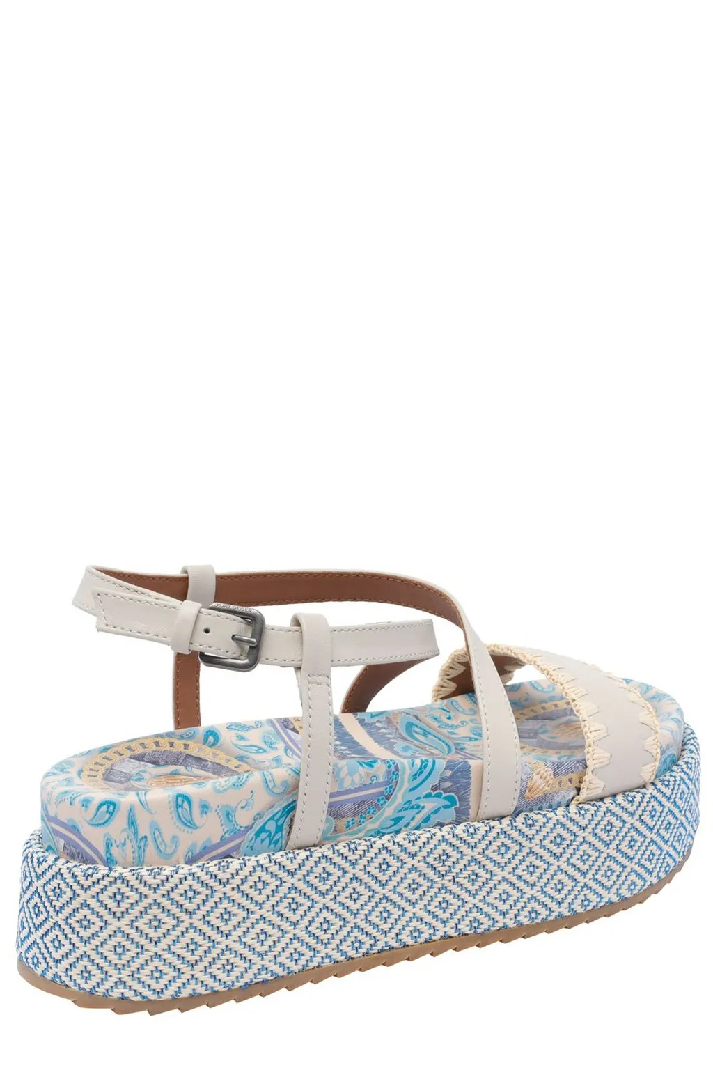 Platform sandals with an ankle strap and buckle closure. The footbed features a paisley print, and the platform sole has a woven geometric pattern. The upper straps are a neutral color with decorative stitching.